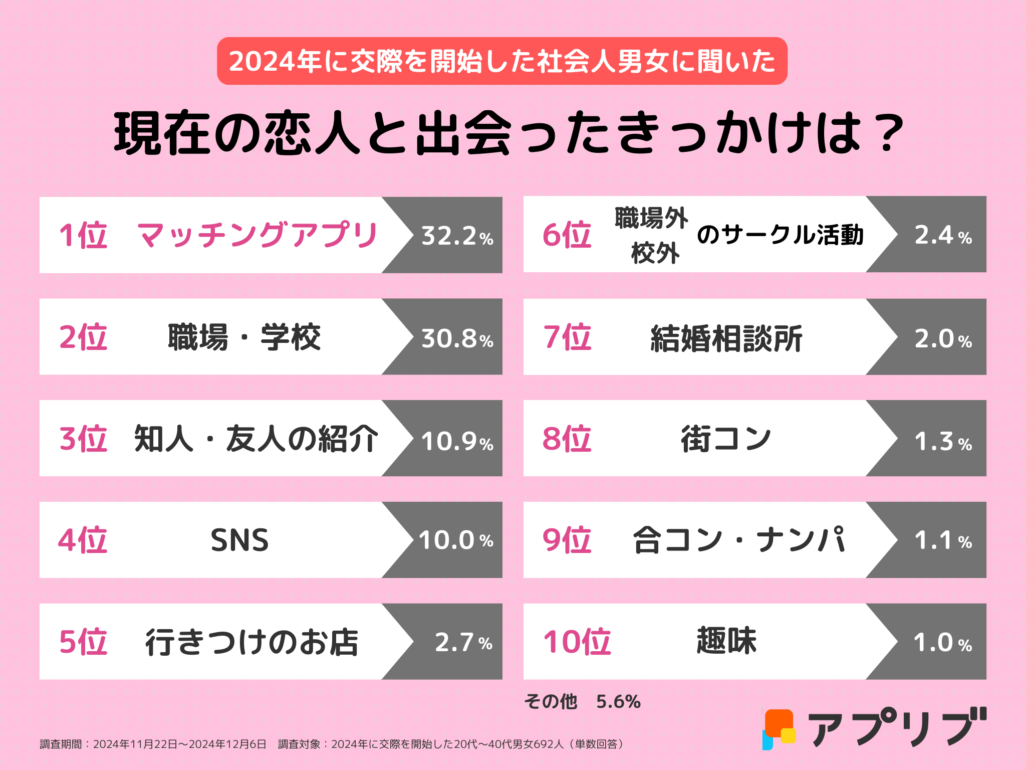 【2025年調査】交際を開始した社会人692人に聞いた、恋人と出会ったきっかけ1位は「マッチングアプリ」、「職場・学校」を上回る結果に - アプリブ