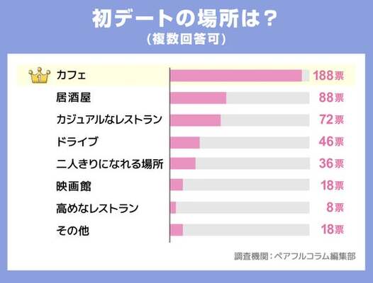 初デートの場所で最も多かったのはカフェの188票で、他よりも倍以上の差で多い結果になりました。カフェなら初めて会った相手と行くのにもハードルが低く、女性目線でも行きやすいのがポイントと言えるでしょう。