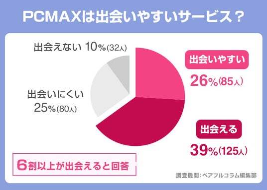 PCMAXが出会いやすさの調査では「出会いやすい」と答えた人が26%、「出会える」と答えた人が39%でした。出会いやすさの評価では65%の人がポジティブな回答をしています。