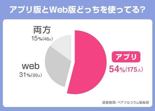 PCMAXの使用率では「アプリ版のみ」が54%「Web版のみ」が31%「両方」は15%という結果でした。半数以上はアプリ版のみを利用していると回答しています。