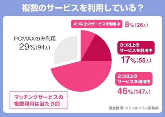 PCMAX以外の利用状況の調査では、複数のサービスを使っている人が全体の71%いました。PCMAXのみという人は29%にとどまり、多くの人は複数のサービスと併用しているようです。